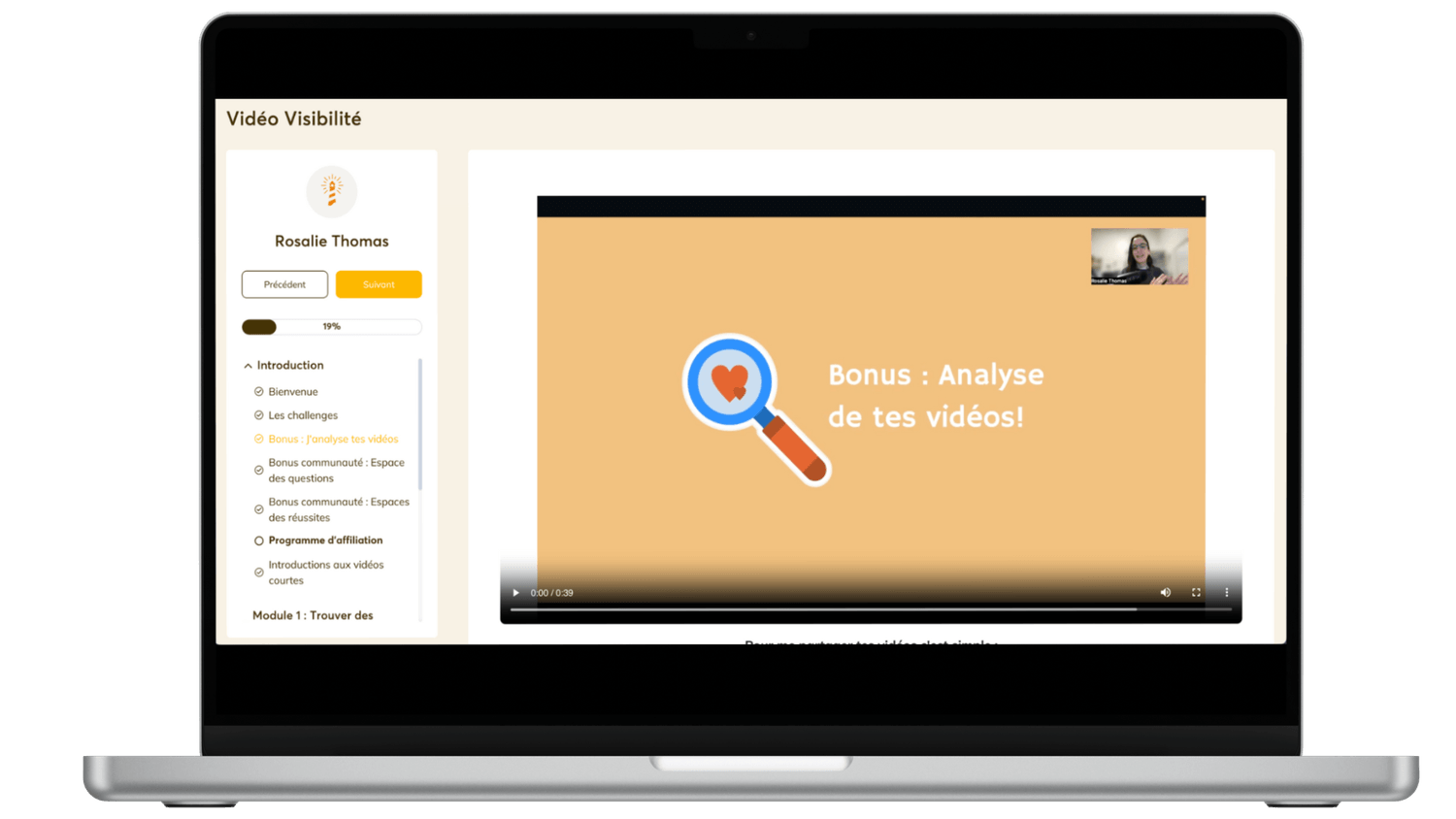 La formation comporte 4 modules répartis en + de 5 heures de vidéo (sans compter les bonus et FAQ). Chaque module comporte des challenges pour t'aider à mettre en action.