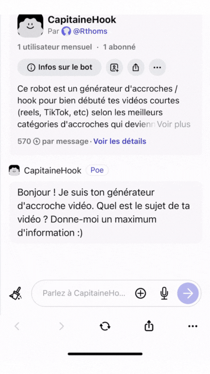 Selon ton domaine, il te propose des hooks pour capter l'attention et des idées à potentiel viral, le tout en se basant sur ma méthode.